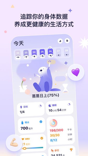 OtterLife 也不只有装「可爱」这一个特点,它同时也装下了丰富的数据,卡路里消耗、每日步数、睡眠、喝水、压力、冥想等项目均有统计。你可以按需从日/周/月/年不同的时间维度进行追踪,更好地了解自己的变化。一些理解起来不太直观的图表信息,比如睡眠质量或 HRV,獭獭会用简单易懂的文字和肢体动作为你解释。这只海獭还是个「演艺大师」,如果你哪天睡得太晚,它会立刻表演「死给你看」。