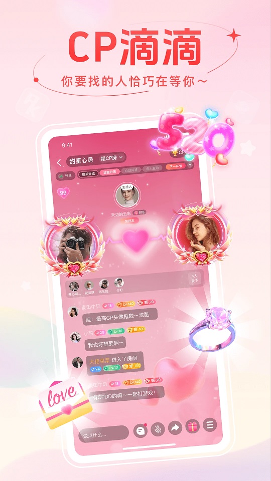 多场景社交支持:涵盖大厅派对厅、家族群聊、CP房等场景,满足多样化需求。