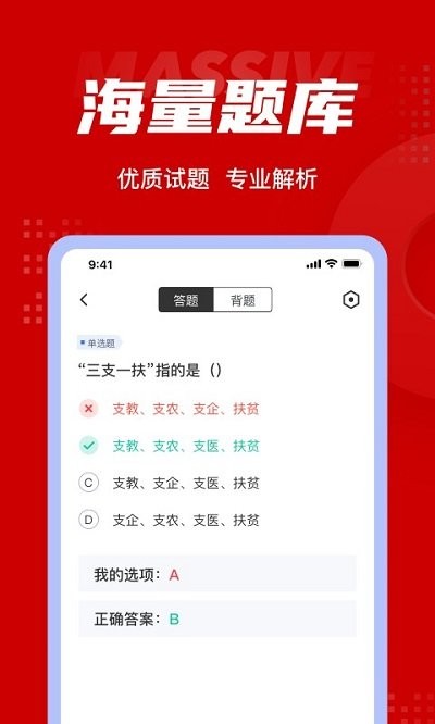 --三支一扶题库内含考点练习,通用卷以及地区卷模拟练习,以及按照固定考试比重的随机式的抽题的真题考场,成绩单实时记录考试数据,一点一滴的反馈考生近期学习状态以及自我正确率的提升,给予考生通过考试的信心。