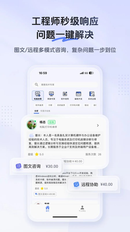 支持图文咨询(文字+图片描述问题)和远程协助(专家实时操作指导),价格透明可自选。
