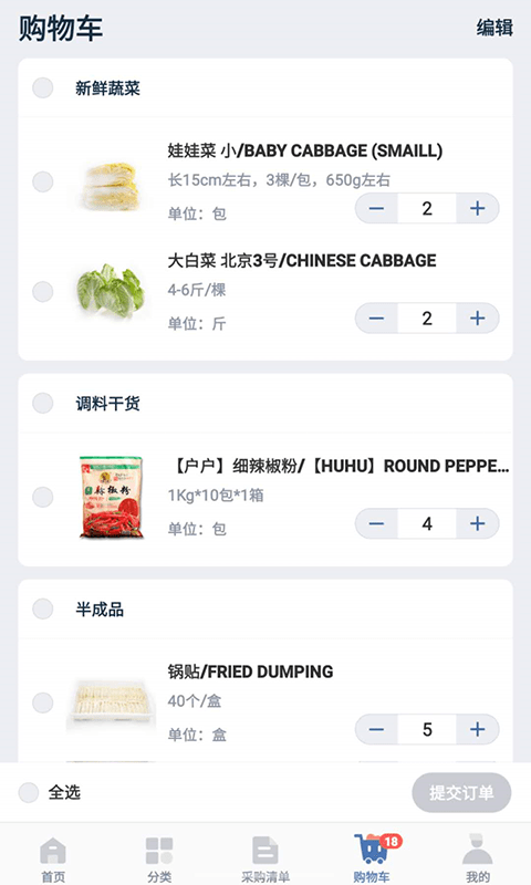 掌上管理购物车内的产品,支持全选管理批量管理,方便线上采购;