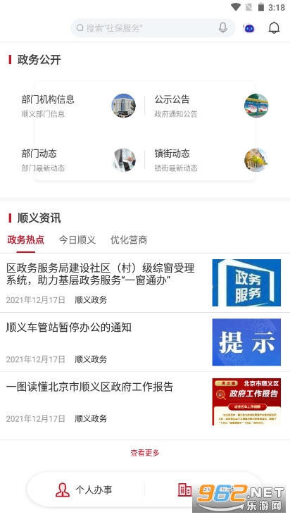 6.部门专区:入驻顺义区人社局、交通局、卫健委等46家区级委办局,提供部门政务办事、便民服务、政策发布等功能。