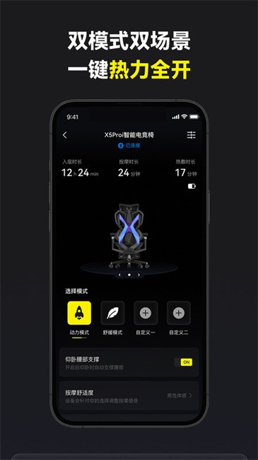 骁骑电竞手机app这是为同系列电竞椅打造的远程设备管理工具。通过将app与电竞椅进行连接后你就能远程管理椅子的各项设置,这样就能通过调整得到更适合自己的电竞椅,从而进一步加强使用体验。
