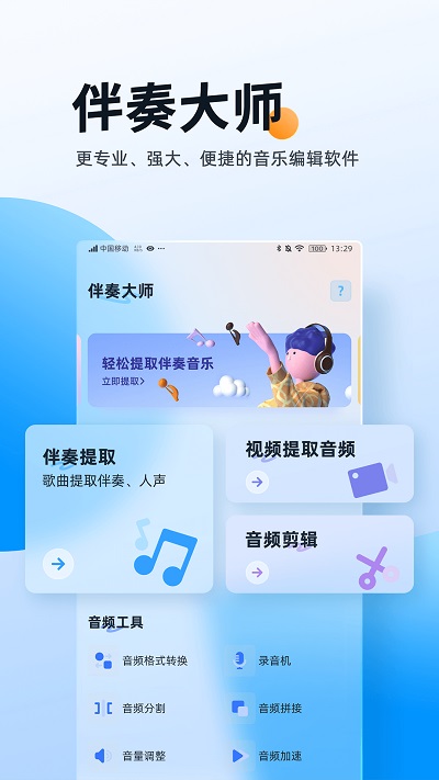 伴奏大师伴奏提取app手机版能够帮助大家轻松的进行提取伴奏,在软件内拥有非常多的功能,能够让大家导入一首歌曲,做到人声和伴奏分离,帮助大家提取出纯伴奏,并且还有很多的音频编辑功能可以使用,让大家在手机上也能够轻松的完成各种操作,欢迎各位下载使用。