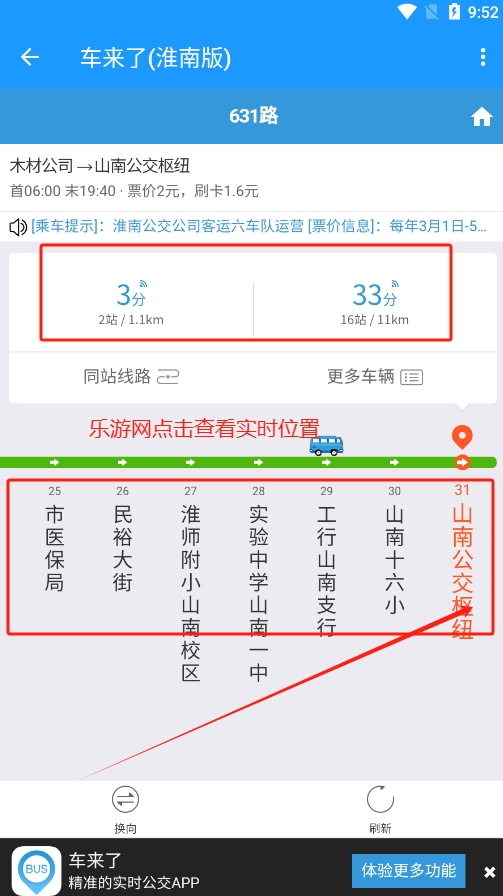 2、在实际的运行信息界面中,能够清楚的看到公交所抵达的实时位置以及同站线路及更多车辆的距离等信息,非常清楚。