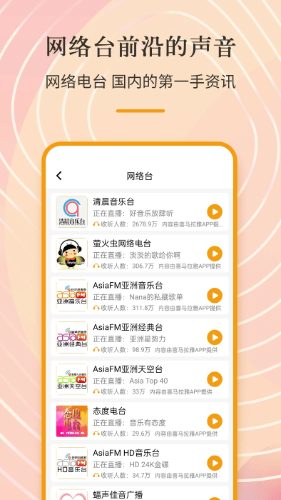 【海量电台】:支持全国所有省市电台、国家直属电台、火爆网络电台
