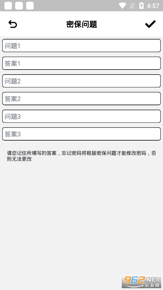 下载安装完成之后设置一个你记得的密码,还有三个密保问题,密码是作为你打开运行软件的启动步骤,而密保问题则是在你忘记了开锁密码的情况下,重置解锁密码是需要的,千万别忘记了!