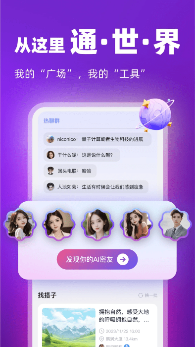 通通app是基于ai技术结合了娱乐,社交方面的互动软件,可以直接的在这里虚拟模拟出不同性格的ai密友,直接的在这里进行聊天,还能与其他的好友群一起玩游戏,聊自己感兴趣的话题,发现更多身边的有趣的事情,来这个换个新的活法,一起下载看看吧!