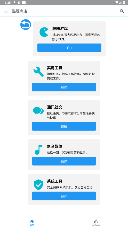 应用分类:酷腕商店将应用按照不同领域进行分类,方便用户浏览和选择。