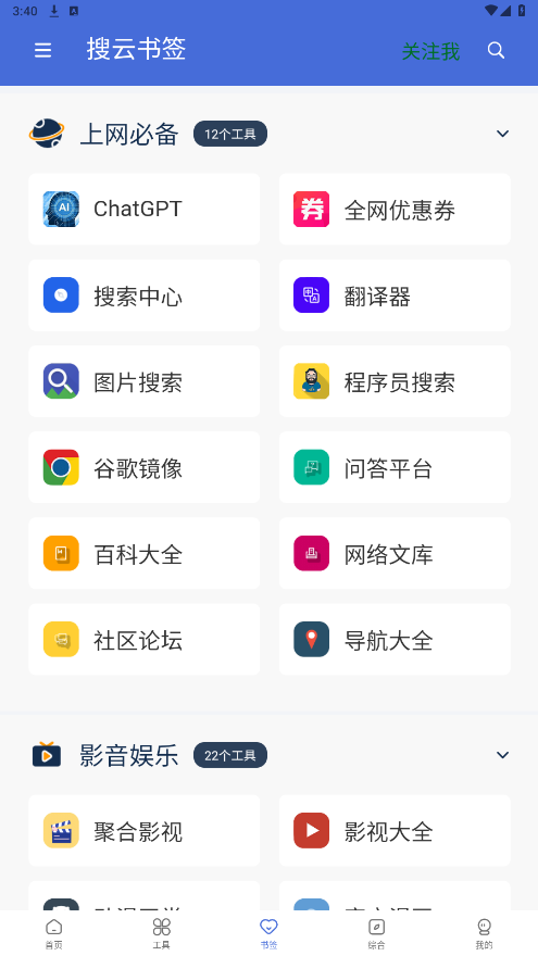 《搜云书签》是一款集工具箱与资源搜索于一体的综合性应用。它旨在为用户提供便捷的生活服务,满足用户日常对于互联网信息的获取需求。无论是寻找新鲜有趣的资源,还是挖掘海量数据,搜云书签都能助你一臂之力。它拥有庞大的资源库,让你轻松拥抱数不尽的互联网资源数据信息,成为你日常生活和工作的得力助手。