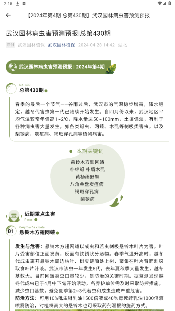发布《武汉园林病虫害预测预报》信息,用户可及时查阅病虫害预警信息与防治建议,提前采取预防措施,做到病虫害的精准防控。