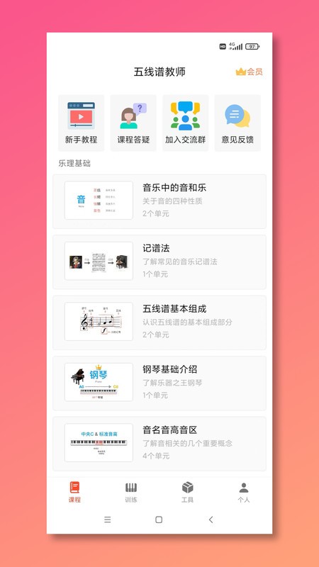 五线谱教师Mustr软件app非常适合热爱音乐和想要学习音乐知识的用户来使用,零基础的小白用户也能用,学习基础的五线谱知识,慢慢学会识谱,可以学习音乐相关的各种乐理技能等知识,资料丰富,干货满满!