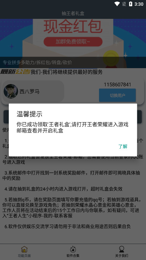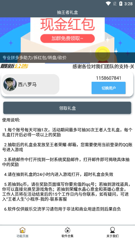《抽王者礼盒》是一款专为王者荣耀玩家打造的辅助工具,能一键查询安卓与苹果平台下所有大区的角色信息,轻松解决“忘区找号”的难题。软件核心亮点在于批量领取各类游戏礼包——每日礼包、每周礼包、精英礼包等福利一键收入囊中,更支持免费抽取永久皮肤、Q币、点券等奖励,无需复杂操作就能享受“上线即领福利”的体验。
