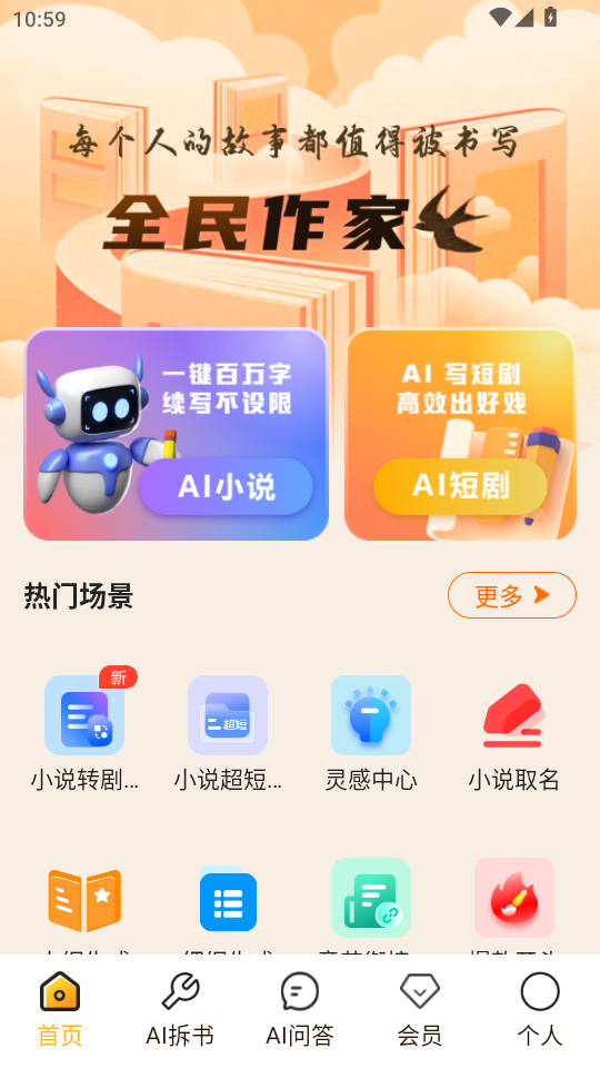《全民作家》是一款以AI技术为核心的智能创作平台,秉承"人人皆可为作家"的理念,为用户提供从构思到成稿的全流程辅助。软件支持百万字小说一键生成、短剧剧本创作、AI拆书仿写、智能封面设计等功能,通过零门槛操作界面与AI全流程助力,帮助新手快速落地灵感,同时为资深作者提供情节优化与创意支持,让复杂写作变得轻松高效。