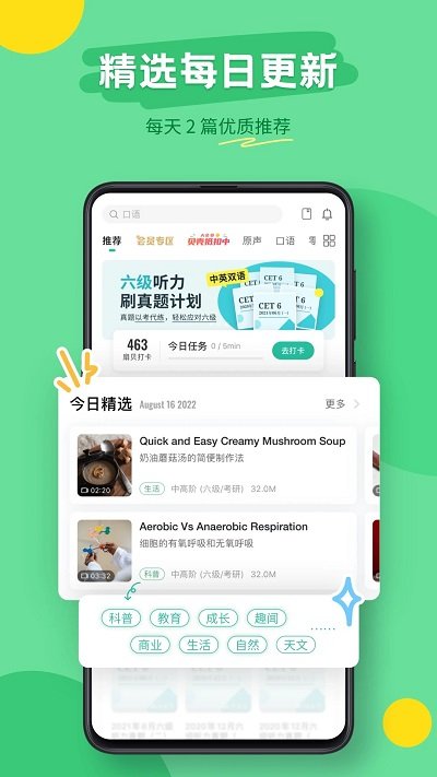 3、练完听力记得做配套的小测验,检查有没有听清关键词,错的单词会被加入复习计划,每天坚持回顾,慢慢就能听懂更多内容。