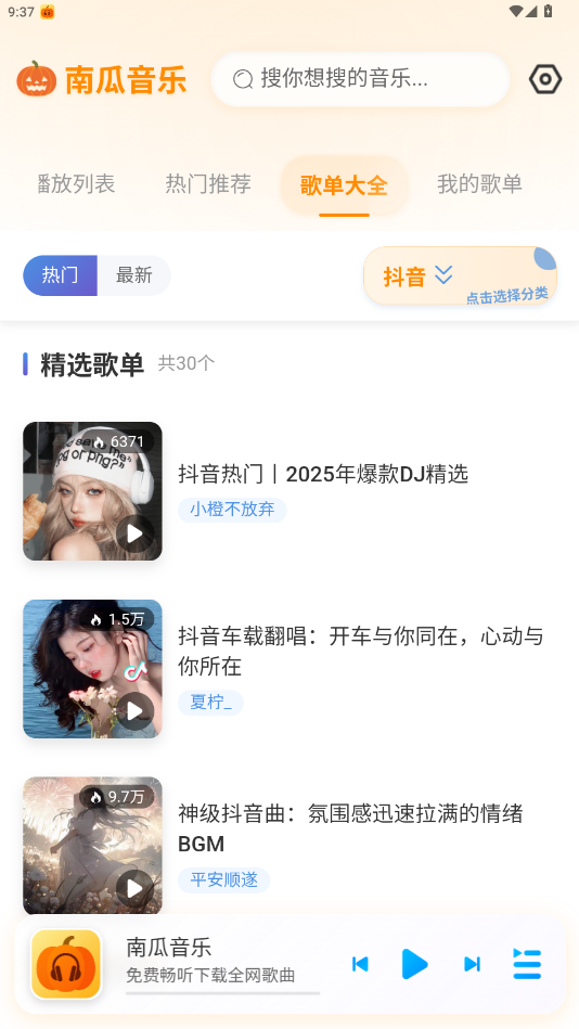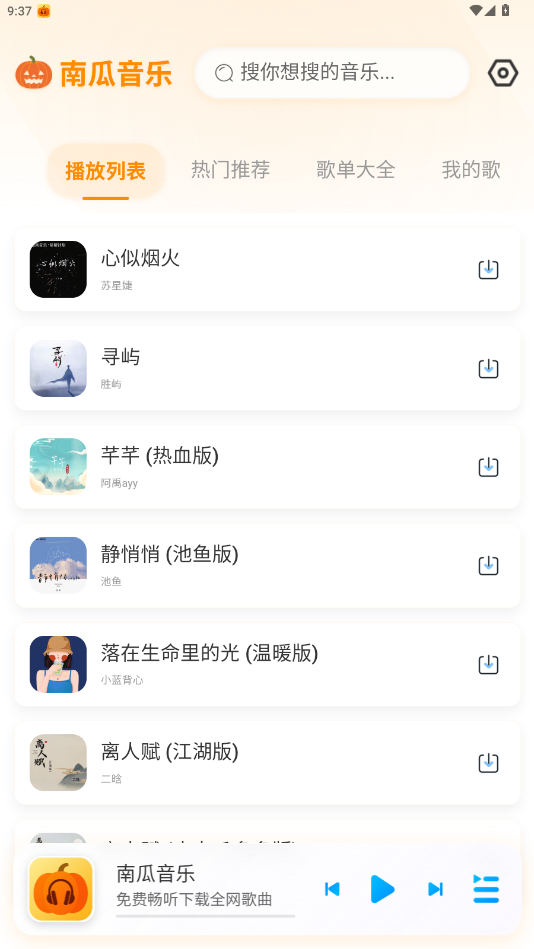 南瓜音乐是你的免费听歌好帮手!这里汇集了全网热门音乐,想听的歌都能找到。不用花钱开会员,没有广告打扰,打开就能畅听。界面简单清爽,找歌下歌超方便,排行榜和每日推荐帮你发现好音乐。体积小巧不占空间,却有着齐全的听歌功能,是音乐爱好者的必备神器。
