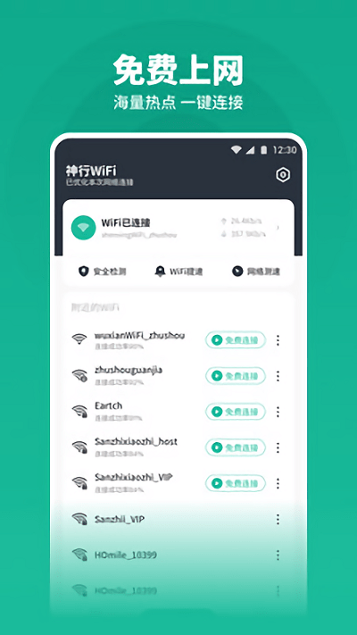 内置亿万免费WiFi热点。无论身处何处,神行WIFI能够自动获取周边免费WiFi热点信息并建立连接,随心所欲的搜寻附近的免费WIFI,免费测试WIFI速度,帮您降低延迟,提高网络稳定性。