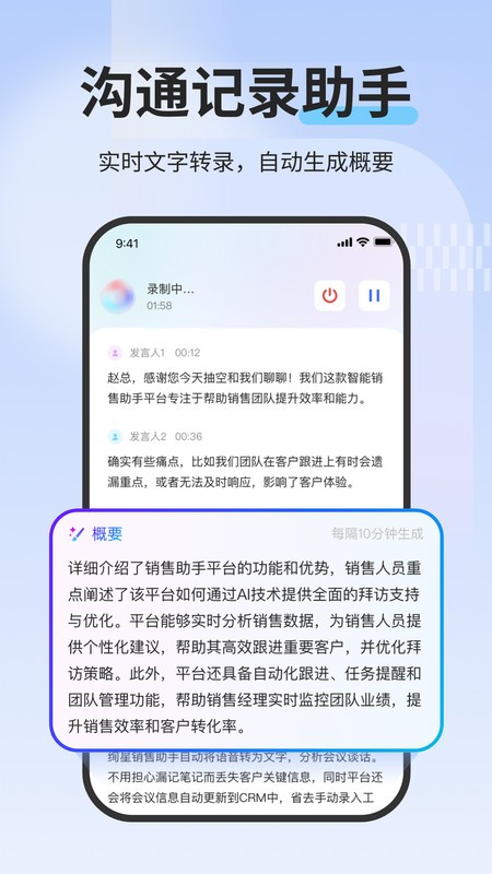 salesmate绚星销售助手官方app是非常好用的销售管理软件,能够帮助用户便捷高效的进行营销,支持将实时的文字进行转录,能够根据内容生成概要,迅速抓住重点,还能对营销内容进行深度分析,及时进行拜访记录和分析,提高销售业绩!