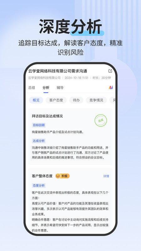 洞察会话的每一个细节,包括待办、客户态度、潜在风险项、是否提及竞品、会话目标是否达成等,帮助销售更好地了解和应对客户需求。