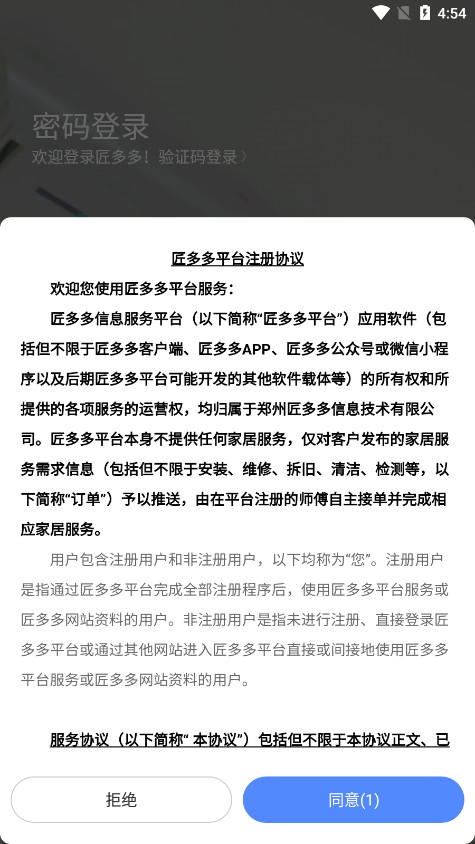 2、仔细阅读匠多多接单平台注册协议,完整阅读后点击“同意并继续”。