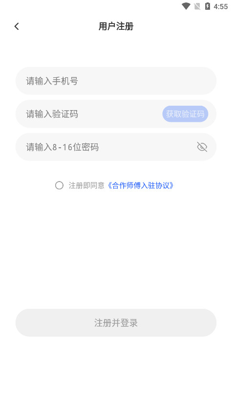 3、输入手机号验证码,设置长度8-16位的密码,勾选“注册即同意合作师傅入驻协议”后,选择下方注册并登录即可。