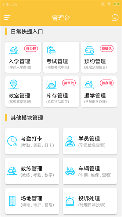 板驹慧驿驾app是驾校管理软件,为用户提供大量的驾校管理功能,不同的板块划分十分的详细,大家可以按照自己的需求点击使用,支持在上面预约场地,让你体验智慧化的驾校管理,有需要的用户快来下载使用吧。