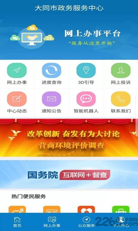 “互联网+政务服务”办事软件。办事范围涵盖大同市、县、乡、村的政务服务,还包含“网上投诉”、“公众服务”等内容。