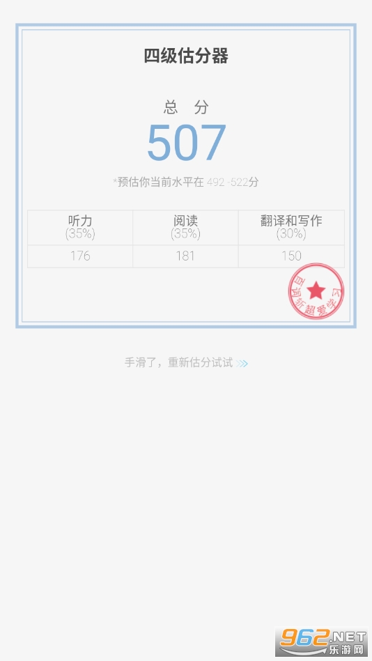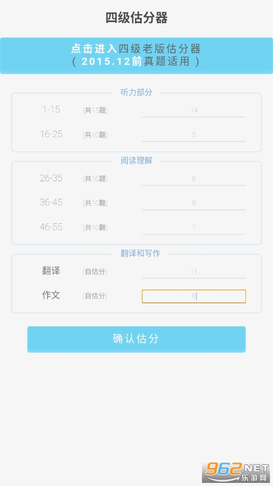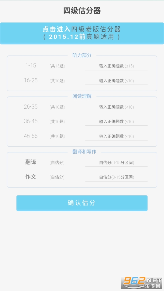 《百词斩估分器四级》是由成都超有爱科技有限公司为考四级的朋友打造的一款估分模拟器,跟百词斩估分器六级差不多,用户可以通过此平台输入听力,阅读理解的正确题数,自己估分翻译和写作大概的分数,然后就可以估计出此次四级考试你大概的成绩是多少了,需要的话就来下载吧!