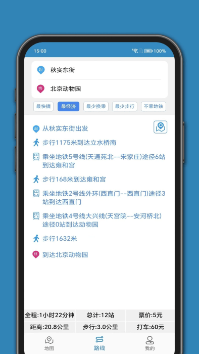 开始地方与终点地点需要输入,帮你选择不同的换乘方式,出行更方便。