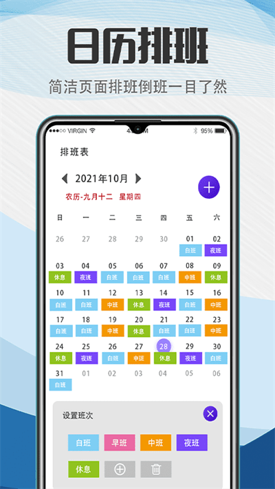 ·通过自定义班次,设置周期轮班快速生成排班日历表,让倒班轮班换班一目了然