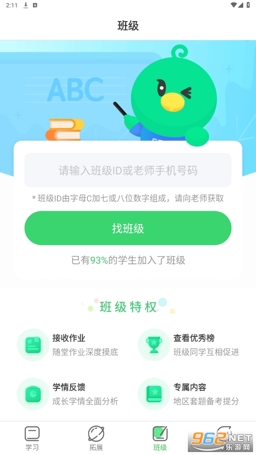 9、支付完成后返回主界面,点击下方班级,输入英语老师手机号点击找班级。