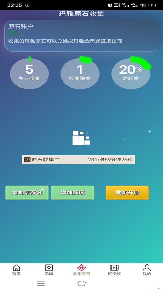 挖宝获利:在玛雅世界中,可以通过褂机挖掘原石,每个原石价值0.001圆。通过观看5个广告和刷视频提高活跃度,可以加速挖宝速度,每直推2人还能增加1深度,更快获得原石。