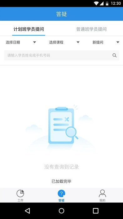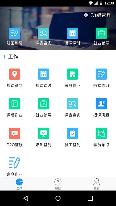 查看学员学习相关情况(考勤、作业、数据统计)以及为学员答疑解惑专区。