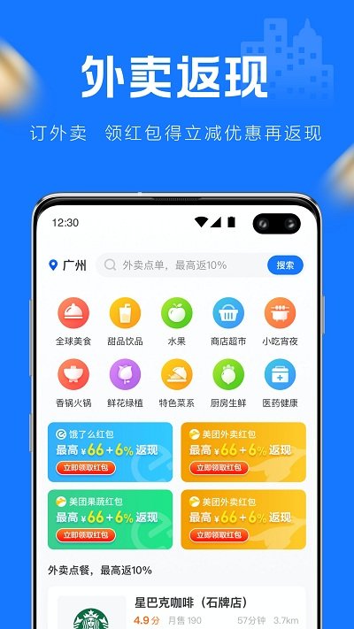 平台内分为4大模块功能,购物返现、外卖返现、买单折扣、加油优惠,