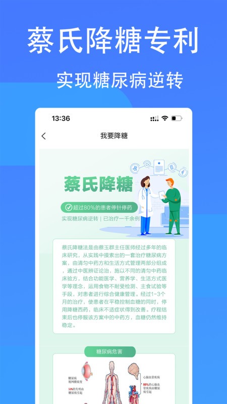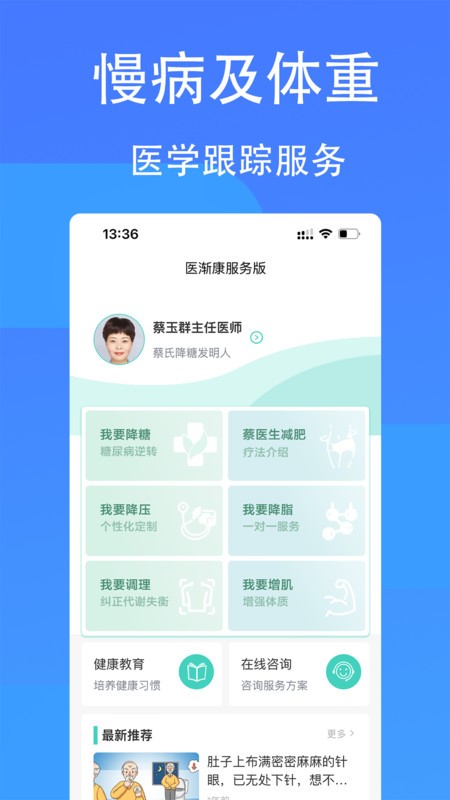 医渐康是以蔡氏降糖法与蔡氏降脂法为核心技术的慢病医学服务平台,平台致力于糖尿病,高血脂症,肥胖等代谢综合性疾病的跟踪和管理,系统集云数据存储,健康数据分析,临床医嘱传输,线上问诊服务,线上商城,健康资讯传播,线上预警服务等功能为一体,帮助用户科学实时掌握自身健康指标情况,及时实施个性化健康措施,促进个体慢病康复,降低慢病并发症发生率。