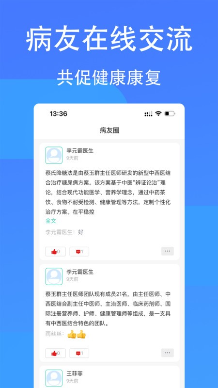 医渐康app官方最新版本为用户提供了慢病管理服务,在这里可以直接向医生咨询,能够和病友交流病情,可以查看和学习健康相关的知识,含有降糖降压降脂等专题板块,查找和使用更便捷!