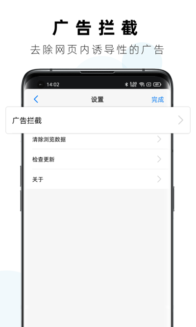 1,广告拦截,提高体验,用户可以使用软件中设计的非常强大的广告拦截功能来进行使用,在进行各种网络模式来进行浏览时避免各种广告弹窗。