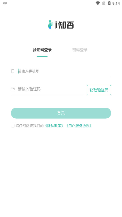 1、点击i知否APP,进入登录界面,默认选择验证码登录,输入手机号,获取验证码,勾选协议,点击登录。