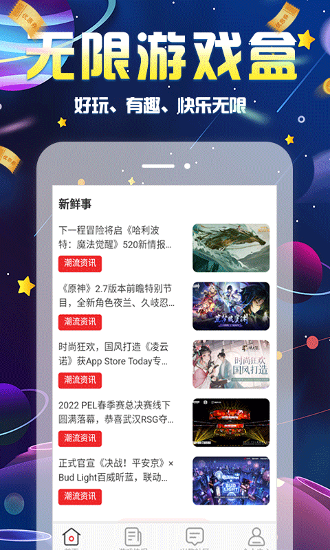 无限游戏盒是一个开放娱乐资讯APP,为大家带来的游戏资讯都是非常的全面,软件按照首页、游戏资讯、社区、以及个人中心等多种功能都为你提供,涵盖了各种新鲜好玩的游戏资讯。快来无限游戏盒认识志同道合的伙伴吧~