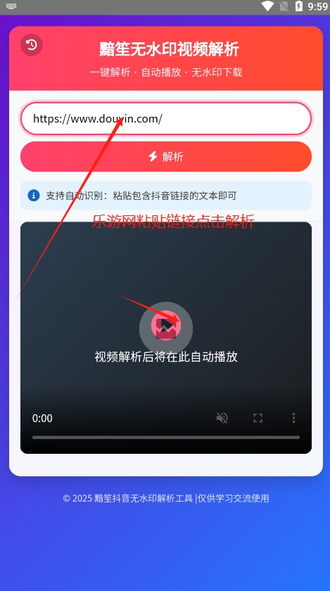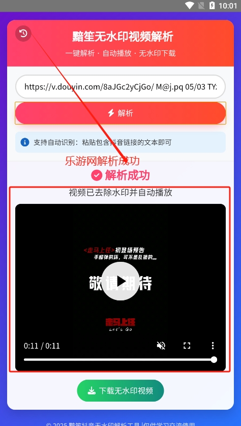 2、支持粘贴抖音分享链接或含链接文本自动识别解析,解析成功后自动播放预览,可直接下载保存到本地。