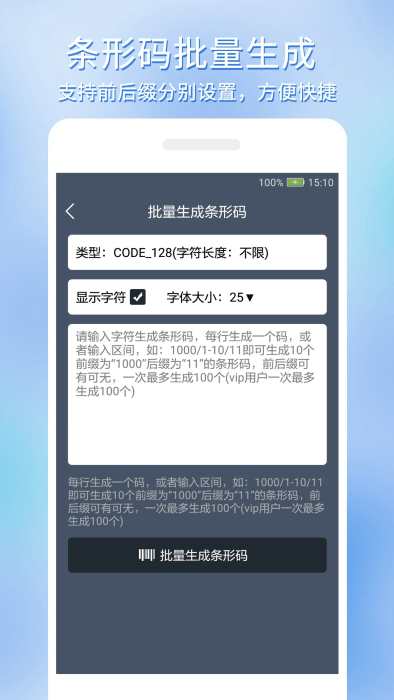 条形码批量生成app是一生成条形码的软件,可以帮助您快速生成单个条形码,也可以批量生成条形码,生成条形码后还可以更改条形码的颜色,支持多种类型条形码,可设置是否显示条形码字符和字符字体大小!