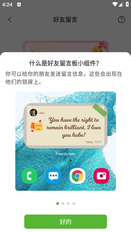 这个小部件显示您朋友的最新状态。当你的朋友感到沮丧时,你可以拥抱他,并在他的锁屏上显示出来。