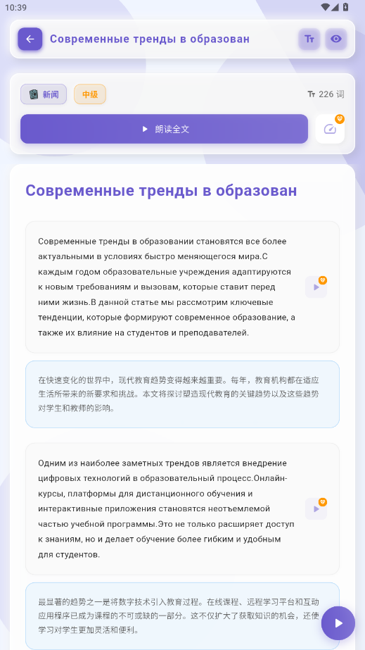 还可以点击阅读,进入阅读板块,阅读俄语新闻,日常生活相关文章
