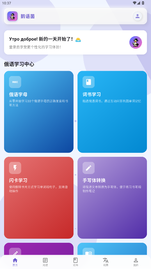 《鹅语菌app》是专为中文用户设计的俄语学习神器!从零基础到进阶提升,互动字母动画、智能词书系统、专业语音播报助你轻松入门;艾宾浩斯记忆算法、AI语音识别、分级阅读让学习高效精准。离线缓存、个性化进度追踪,随时随地玩转俄语。告别枯燥,开启你的趣味俄语之旅!