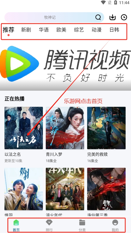 1、打开软件,开屏展示部分与原版腾讯视频播放器一样,上方有推荐、新剧、华语等部分,下方则是首页、排行、分类以及我的等部分,这里我们打开一步最近热播的电视剧。