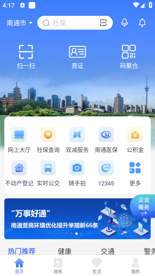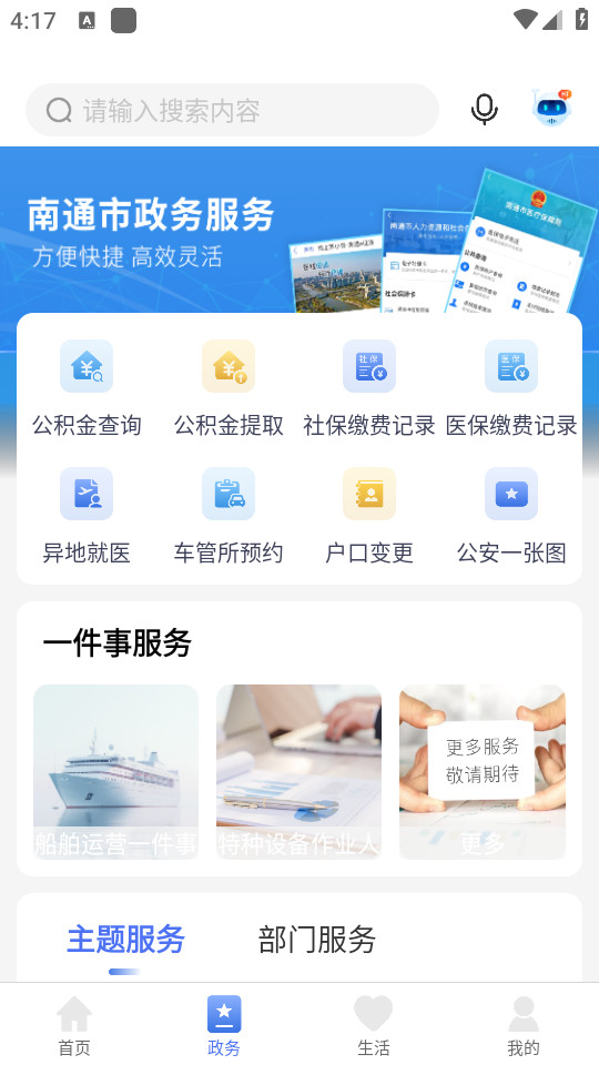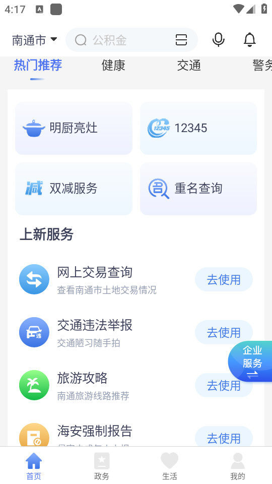 在线办事、查公积金、违章代缴、南通资讯;