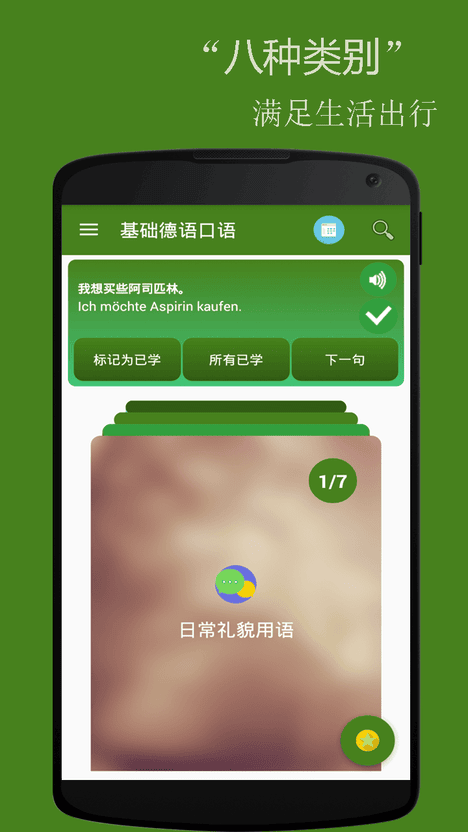基础德语口语专为零基础学德语爱好者打造,简单实用,其中包含了最常用的基础德语口语与短语,是您随身携带的德语老师,帮助用户打造一口流利德语。