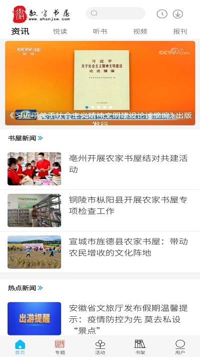 4.资讯:提供书屋新闻、悦读推荐、农业新闻、热点新闻、社会新闻、军事新等讯息,实时更新,满足农村群众对社会关注的需求。