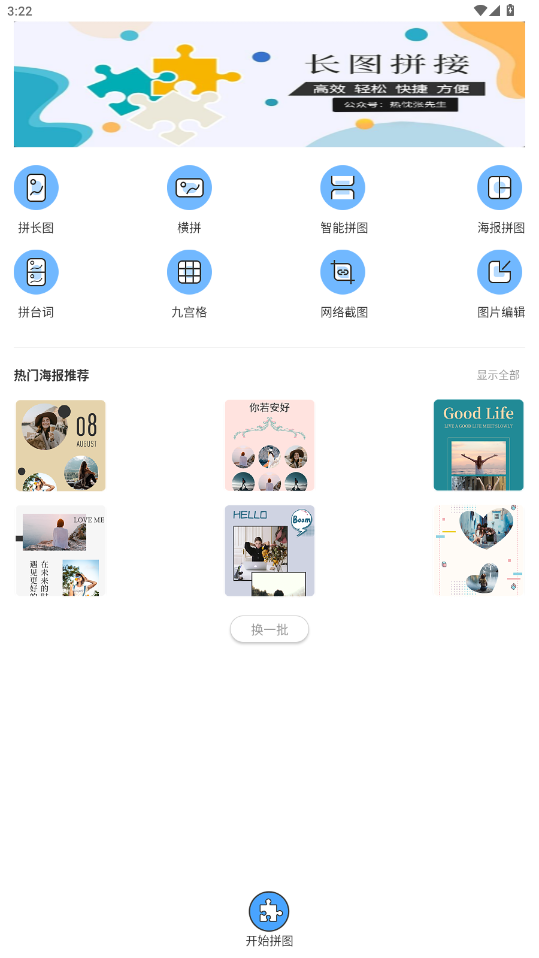 打开长图拼接拼图app,点击下方开始拼图