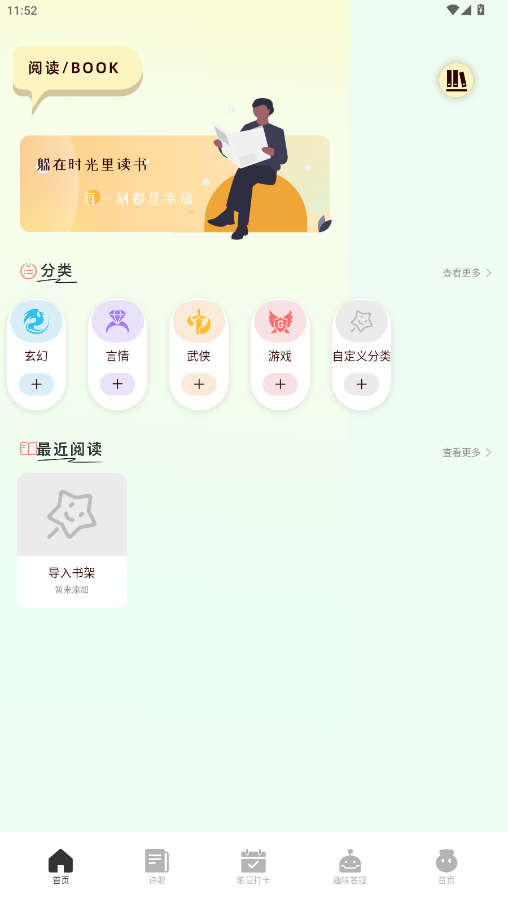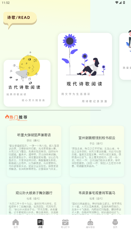 诗歌阅读、趣味答题挑战不一样的阅读模式,丰富自己的知识面。
